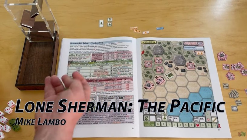 Lone Sherman: The Pacific is a solitaire book wargame designed and self-published by Mike Lambo. The game puts the player in charge of a single Sherman Tank and its crew on several Pacific Islands in World War II and tasks the player with navigating the lone tank through very challenging scenarios based on several of the island hopping campaigns including Saipan, Tarawa and . While this game is not a “narrative driven” solitaire game as such, with a little imagination it will provide memorable stories and really keeps you on the edge of your seat as you roll your dice, choose your actions and hope for the best. Some events are randomly generated in the game, but the player always has at least some degree of control over the level of risk they wish to take and how vulnerable they leave their tank to these events. This typically manifests itself in your position on the board, how near you are to enemy units and what condition your tank is currently in and whether you pause your attacks to repair or extinguish fires.