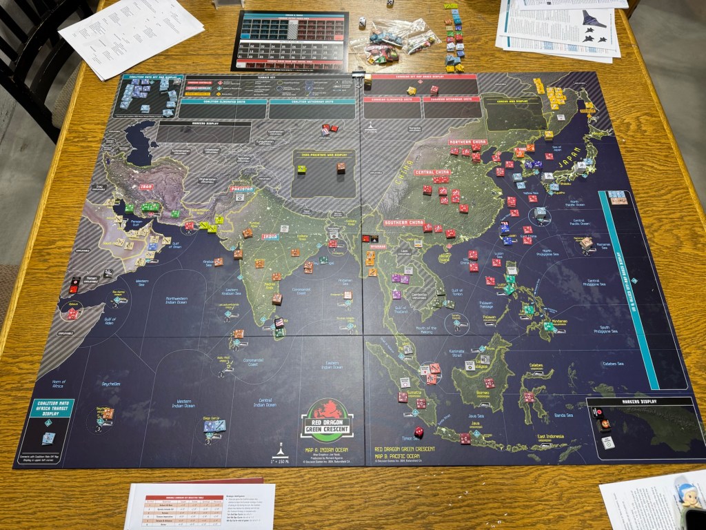 We have not played all that many modern warfare games in our time as wargamers. But, in 2024, we played several including the likes of Next War: Poland from GMT Games, The Enemy is at the Gates from Compass Games and now the last of the year was Red Dragon/Green Crescent Deluxe Edition from Decision Games. These games all typically focus on warfare at all levels including the use of new technologies such as EMP’s, Cyber Warfare and Hacking as well as air, air/naval, ground combat and various commando style operations and missile strikes, including tactical nukes. But, typically these games are extremely detailed and complex and tend to lean toward the unplayable side of the ledger. But that was not what we found in the game as we very much enjoyed our experience with Red Dragon/Green Crescent Deluxe Edition and frankly were blown away with how good it was. I want to share my thoughts about this game and why we enjoyed it so much in this First Impressions style post.
