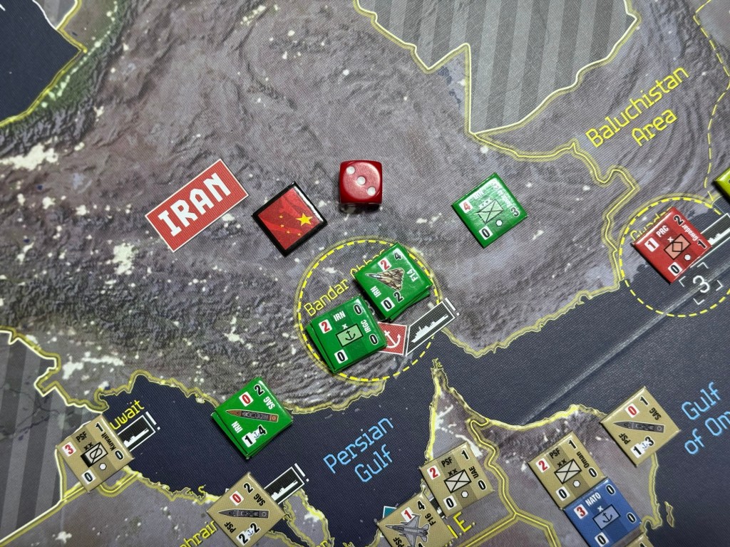 If the 2d6 roll results in a Random Event, then the players will roll 2d6 again and consult the appropriate table. These events include things like mines detonating in the Persian Gulf, various numbered operations being unable to be taken that turn for one reason or another but more often than not things like supply issues, weather, internal fighting amongst commanders and branches, the presence of NATO forces. an ally changing their stance on their alliance and lots of other choices. Once these events occur, you typically make them off the list and they cannot occur again. None of the events are game breaking but they give the game just enough uncertainty to keep things very interesting.