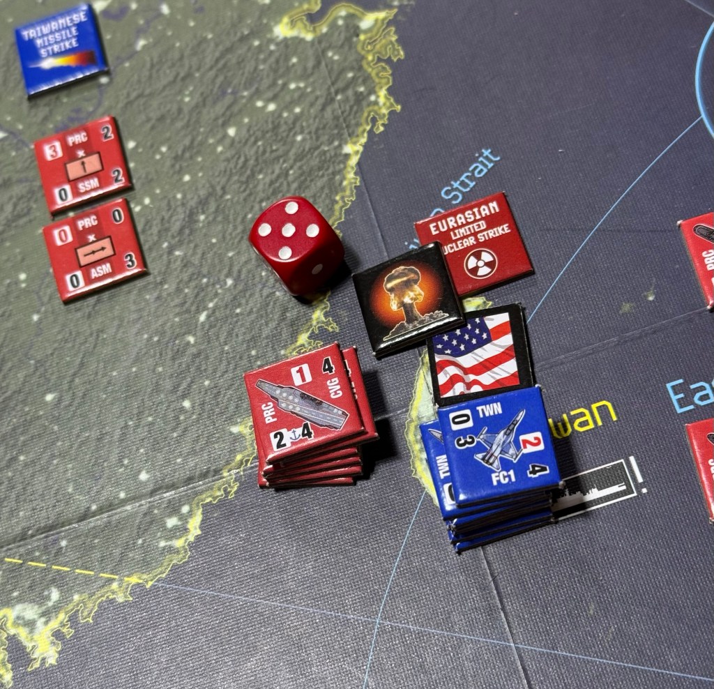 There are a certain amount of protected units, such as Aircraft Carriers and Amphibious Landing Craft, that are effectively screened by all of the other ships in the taskforce. They can only be targeted once and if all other units have been hit and destroyed. This rule made a great deal of sense to us and we had no issue with its inclusion as it made for the realistic possibility of amphibious landings. And it also gave us the courage to throw caution to the wind and take some chances by moving in our big guns even though we might lose them. This made for a very chaotic and kinetic situation and we had a blast with the combat. I am not an expert on this geopolitical situation but my initial thought was that the PRC was a bit underpowered. They didn’t really have the number nor power that the United States and her allies did, which is probably fine but it struck me as a bit odd.
