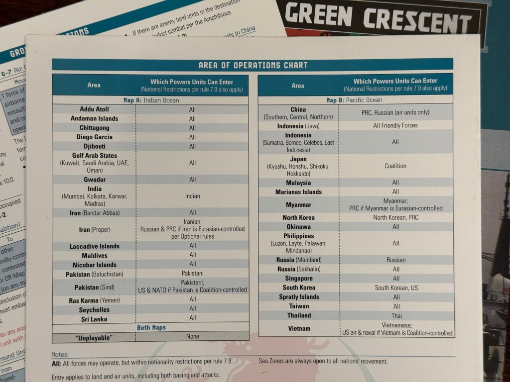 One of the points that was made by Decision Games as they began marketing this game was that they had taken in account the various new developments in the strategic situation covered since the original games were published. With the People’s Republic of China (PRC) expansion in recent years leading to the establishment of many bases throughout the Indian Ocean and Russia being engaged in a war in Ukraine as well as the 2021 Taliban victory in Afghanistan shifting the perception of the power of the United States and its Coalition partners. As already mentioned a bit, each of the Powers are also using online advanced weapons systems and new tactics and these advancements are modeled with 2 general time frames for the scenarios, one set in the 2020’s and the other in the 2030’s. I am not a modern warfare aficionado and frankly don’t have an in-depth knowledge of the makeup of the PRC or Russian armed forces but the general makeup and values assigned to the different units felt about right and seemed to take into account some of the newer technologies developed over the past 10 years. The Order of Battle appears to be almost entirely new or newly conceived and I would give them a big round of applause for making it seem appropriate and for the most part balanced.