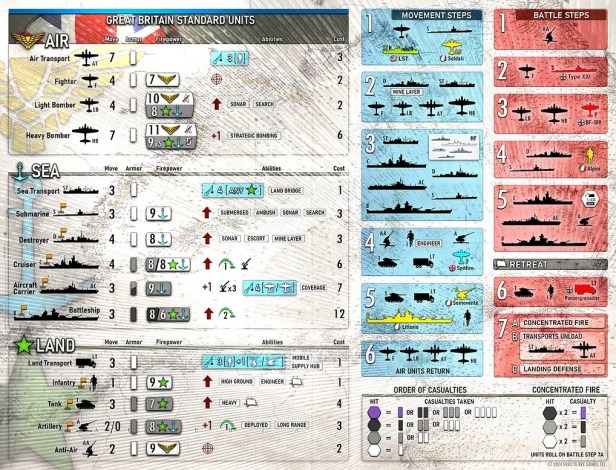 Seth and Chris: Everything is unit based with a focus on combined forces. In addition, nations move and fight together (Allied players vs. Axis players), not nation by nation. To enable better battles, first we use movement steps. In each step, only a handful of units can move and declare battles. Faster, lighter units (e.g., fighters and submarines) move sooner than the bigger, heavier units (e.g. tanks and battleships). In addition, lighter units may also get to move and declare battles several times while heavier units only get to move and declare once. This approach allows for combined forces to provide big advantages – fighters providing escorts and clearing air space, destroyers escorting transports and clearing key shipping lanes, ships and artillery bombarding, etc. For each battle declared, we then use battle steps that allow the abilities of units to come forward, and award using combined forces. For example, on battle step 1, only Anti-Air can fire / roll, and casualties (incoming enemy air units) are removed immediately, before they get to fire / roll. Then, on battle step 2, fighters get to shoot and clear air space, taking out bombers. Then, step 3 bombers, followed by ships and then land units. So planning ahead with your teammate and using combined forces really pays off.