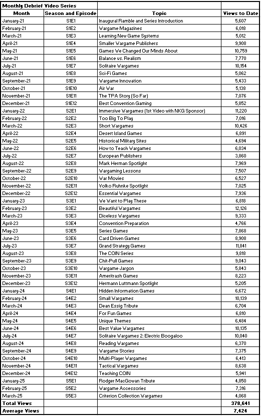 In 2021, we started the Monthly Debrief Series of videos where we talk about what games we played the previous month and what we plan to play in the coming month as well as what games are on Kickstarter and a protracted discussion on a chosen monthly topic. These videos have been very well received. We have done one of these videos each month since their inception in January 2021 and to date are in Season 5 Episode 4 and these videos have garnered a total of 378,641 views. This equates to a total of 7,424 average views per episode, which is a number we are very pleased with! We tend to ramble on in these videos and they are over an hour each with some approaching 2 hours so thank you for watching and sticking with us as we go on and on! This years we have started Season 4 of these videos and I am really amazed that they still garner views and engagement. They are admittedly long, and I always find them fairly boring, but people tend to view them for sure. We still have lots of great topics that we can discuss and always seem to come up with something new to share.
