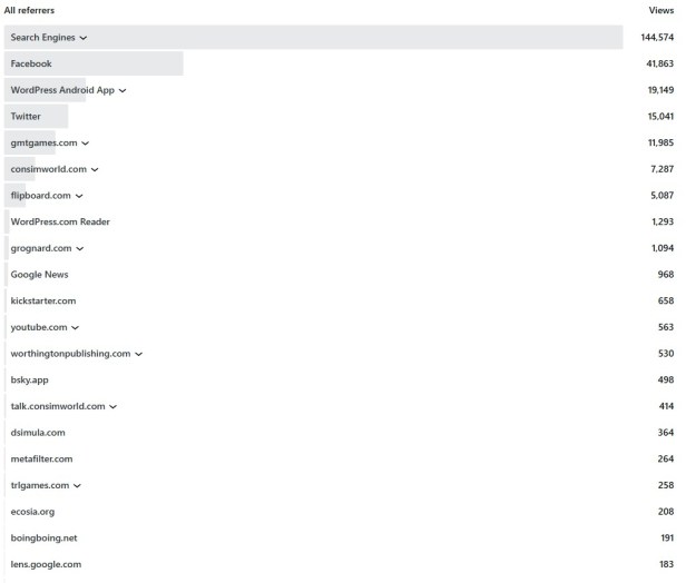 Over the past 9 years, we have built quite a library of content and we still come up often in internet searches which brings a lot of visitors to our site. In fact, here is a look at some interesting data from the blog where you can see our top Referrers from 2024. These are sites that send visitors to our site as they have hosted or linked to our articles, videos or other content and people find us this way. Notice though that Search Engines sent 144,574 views our way, which is about 22.5% of our total views (Total Views for 2024 were 643,630). Social Media is also a good source for views as Facebook brought in 41,863 views and Twitter 15,041 (down quite a lot over 2023 from 19,402 views). GMT Games is a big part of our views as they have referred 11,985 views (down over 2023 from 14,472 views) as well as Consimworld which referred 7,287 (down a bit 2023 from 8,529 views). Not shown in the graphic are the myriad of smaller referrers that send views our way. That list is really very long and I couldn’t post the whole graphic but there are about another 130+ referrers ranging from 250 views referred all the way down to just a handful of referrals. We appreciate all the views though and will never not be grateful for any help that we can get.