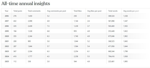 Another interesting statistical compilation that is provided by our WordPress software is a look at not only the number of posts but also the total number of comments, total post likes, total words written as well as some averages across those numbers. Interaction on posts has been much improved over the past few years as compared to previous years with more comments and more likes. This is a very good thing and an upward trend that I would hope to see continue as I do love to hear your thoughts on my posts and about the games or subjects being covered. I consider myself to be pretty wordy in my posts and that is being proven with total word counts in 410 posts in 2024 of 794,416 and average words per post of 1,938, which are both higher than in 2023. It appears that through the first 3 1/2 months in 2025 I have become wordier but I know that I have done more lists and have started some more in-depth looks at games and also posted a lot more.