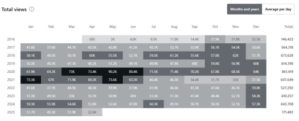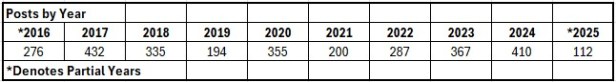 You will also notice that we have done 2,968 posts over the 9-year period that our blog has existed. Remember though that 2016 only included 9 months of content while 2025 only takes into account the first three and a half months of the year, which accounts for the lower numbers for those shown years. If you look at the individual years’ numbers though you will see that we posted a lot in 2017 (432), 2018 (335), 2020 (355), 2023 (267) and 2024 (410) while 2019 (194) and 2021 (200) were both a bit of a slow year as I had started a new job and was very busy with some travel and out of town work that kept me from my regular routine of writing. 2022 picked back up though and I made a concerted effort to get back to regular content. Also, early on, remember that there were three of us writing for the blog (remember Tim?) and over the past few years it has just been Alexander and I, although at this point as mentioned earlier I do 99.9% of the posts on the blog. Prior to this past year, one of the reasons that our statistics have continued to rise is that we posted more regular content with at least 5 posts per week, sometimes as many as 7 at least for the past year and a half. This consistency has kept our blog fresh in our readers minds and on their timelines. Over the past few years, the number of posts has has begun to increase again and we on an upswing at the moment and I fully expect to have nearly 400 posts again in 2025.