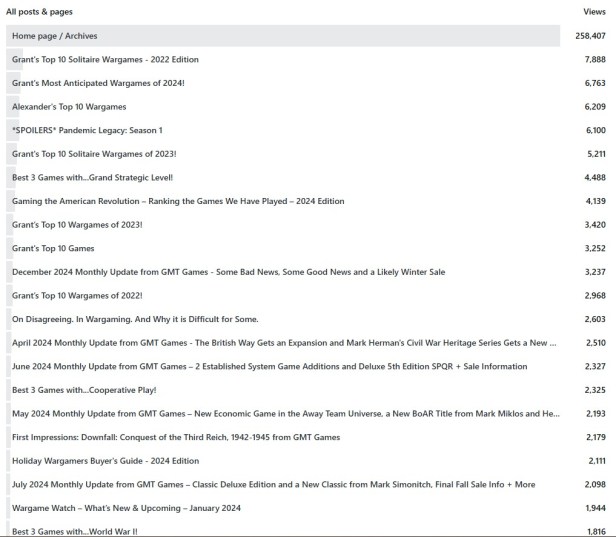 In the anniversary post last year, I showed you a list of our best performing posts on the blog. So I will continue that trend this year by showing our best performing posts for 2024. The same as last year, it seems that lists of games do the best, including features like Grant’s Top 10 Solitaire Wargames – 2022 Edition (I have not updated this list since 2022 but plan to this year), Grant’s Most Anticipated Wargames of 2024!, *SPOILERS* Pandemic Legacy: Season 1 that has performed well for years, Alexander’s Top 10 Wargames, Grant’s Top 10 Solitaire Wargames of 2023!, Grant’s Top 10 Wargames of 2023!, and so on. People really like lists as they are a quick source of lots of good games that people can investigate, purchase and play. A couple of other key performers were my Gaming the American Revolution – 2024 Edition, December 2024 Monthly Update from GMT Games and On Disagreeing. In Wargames. And Why It is Difficult for Some. Most of our blog posts get 300-700 views in the first week they are on the blog and then over the next month will get an additional 200-400 views, sometimes more depending on the topic and how often I share them on social media. We are not a high view blog, partly because we are a wargaming blog really with only ever a smattering of coverage for traditional board games, but also because we don’t pay to promote our posts on social media nor do I spend a glut of time posting our stuff on other forums. I could do that and we would get more response but I just don’t have that kind of time.