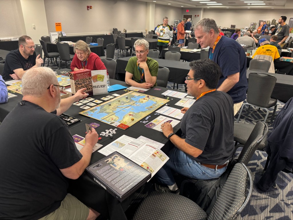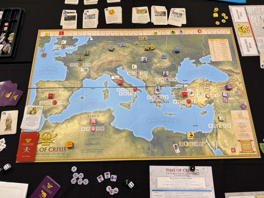 Bright and early at 9:00am, we hosted 2 teach and play sessions of Time of Crisis from GMT Games. Time of Crisis is a hybrid wargame that covers the Crisis of the Third Century, where the Roman Empire nearly collapsed in the face of calamitous internal and external strife, including civil war and barbarian invasions from all sides. The game uses deck building as players attempt to spread their influence, establish her or ships in provinces, develop infrastructure and fight off barbarian invaders and other pretenders as they try to take control of Italian and seat themselves upon the throne. This game is a fantastic introductory level wargame that plays in about 90 minutes and that looks really great on the table.