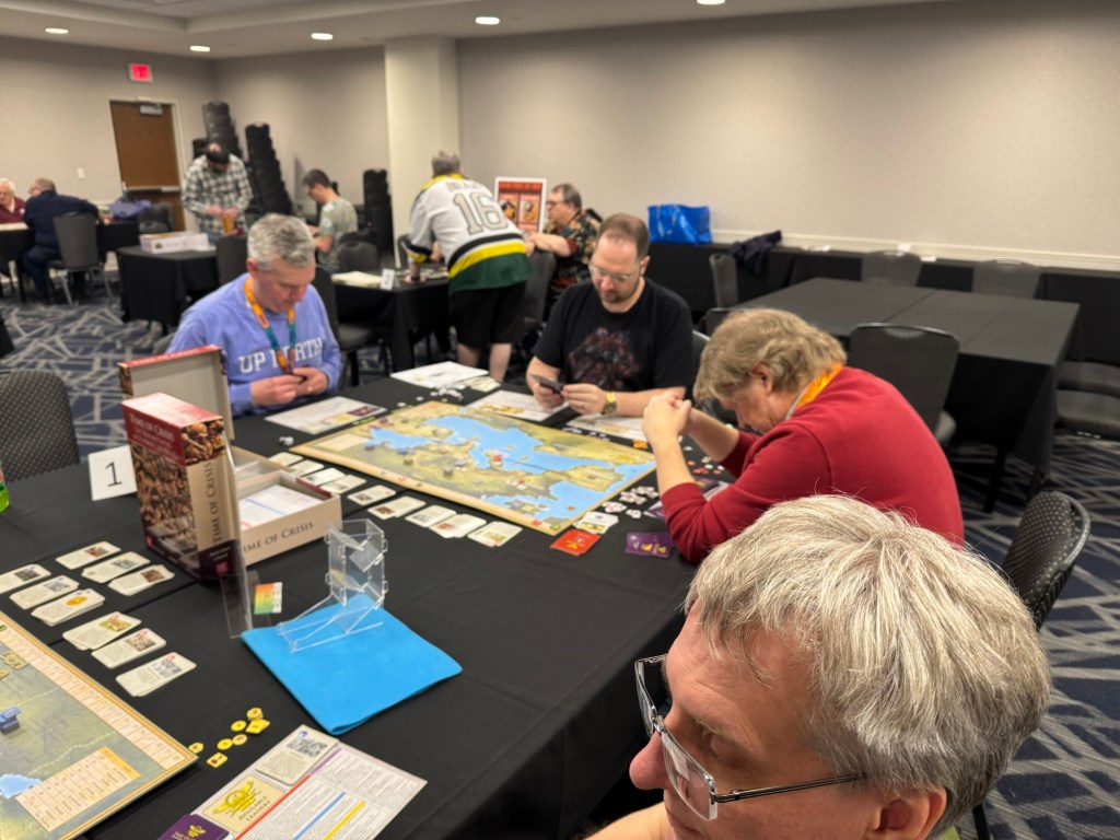 Today’s entry is going to be very concise because I am completely exhausted. After 4 1/2 days of gaming, I can honestly say I’ve had enough. At least for this trip. We ended up playing a total of 14 games. Yes you read that currently. 14 games including: Crusade & Revolution from Compass Games (just amazing!), Black Orchestra from Starling Games (I’m just sad it took us so long!), 1714: The Case of the Catalans from Devir Games (a real shocker this one…so very good), Congress of Vienna from GMT Games (I want to play more), Tattered Flags No. 1: Into the Whirlpool from Blue Panther (2nd time and I liked it even more!), Rebels Against Rebellion from Flying Pig Games (going to be sneaky good), Divine Right from Pungo Games (glad we played but I’ll take a pass), True Command from Catastrophe Games (surprised how much I liked this one), Crisis: 1914 from Worthington Publishing (an instant classic), Successors 4th Edition from Phalanx (I think I’ve had my fill of this one for a while), Nations & Cannons RPG from Flagbearer Games (we did it again with something supernatural (a werewolf) finding its way into history), Time of Crisis from GMT Games (always fun to share this peach of a game, New Cold War from VUCA Simulations (gorgeous and interesting CDG) and finally The Fellowship of the Ring – Trick Taking Game from Office Dog (a really solid game). And we are already planning what we will play and do next year. We had a great time! Now into a quick synopsis of today’s 3 games.