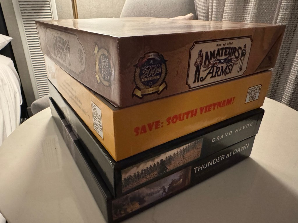 After this game, we headed to the vendor area and purchased 4 more games including Amateurs at Arms: The War of 1812 from Clash of Arms Games, Save South Vietnam from Fortress Games, Blind Swords Series Grand Havoc from Revolution Games and Blind Swords Series Thunder at Dawn from Revolution Games. Some really great titles for a great vendor from Virginia named Age of Glory. We purchased too many games and needed these about as much as we needed holes in our heads!
