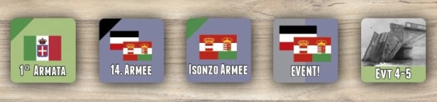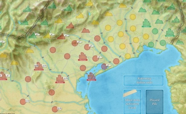 Hermann: Well, as referenced in your earlier question, all those important aspects of the campaign – the changing state of the Italian armies, their command shakeup, the actual military goals of the Central Powers armies, their stretching logistics network, and the divergent interests of the German high command – were all design challenges. Incorporating all those factors without forcing the issue through scripting was a tough grind and I hope that I did meet the challenge with the final product. The simplest and yet most direct way to handle these challenges is by using “design for effect”, which is basically finding the shortest and easiest mechanic to best reflect the conditions with which to produce the results you want. In other words, something that will feel right in the end without an accompanying cavalcade of new rules and charts. So, to handle the logistics nightmare, I color-coded the spaces on the map so that the farther along the track the CP units advance, the more Action Points they need to spend to conduct certain actions like bombardment, regrouping, etc.