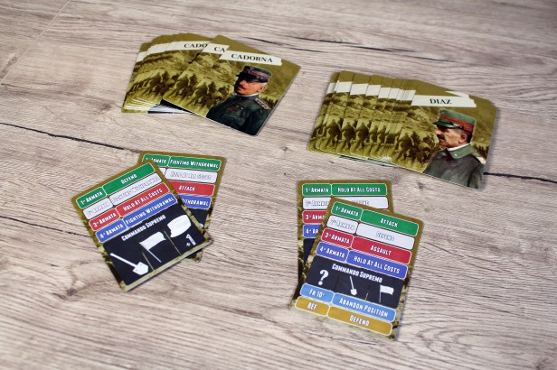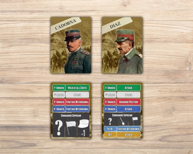 Hermann: The Bot is built into the Allied Army Activation Cards. For the Cadorna Cards, it will issue an Order to each Italian Army based roughly on what that army tended to do during the early stages of the campaign. So, more withdrawal and defensive instructions, but not always. Again, this game uses my overriding design theory of “historically-weighted chaos” – anything can happen, but it will be within the reasonable parameters of the historical situation. Thus, no aliens will land, or zombies emerge from the graveyards…at least not in this edition. 😉 With the Diaz Cards, which come into play when Cadorna gets relieved of duty, the Italian armies get a stiffer backbone and become sharper and more aggressive, and his cards also now include the arriving French and British contingents (which were sent to the Italian front as the Allies realized the extent of the crisis occurring in northern Italy). In addition to these specific Orders, there are also entries on both cards for the possibility of additional actions by the Commando Supremo – the supreme headquarters of the Italian armies – representing higher level orders. These are additional actions that will create events, build entrenchments along the Piave River line, rally defeated troops, etc. There will be lots of variety and challenges for the player to experience with this AI system.