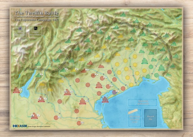 Hermann: The game covers the final Central Powers offensive in northern Italy in 1917, often referred to as the Caporetto Campaign. It is a solitaire design where you play as the Central Powers armies of Germany and Austria-Hungary as they attempt to knock Italy out of the First World War. But you have to do so quickly as the Allied forces of France and Great Britain react to your offensive and Germany needs to divert resources for the upcoming Kaiserschlacht on the Western Front.