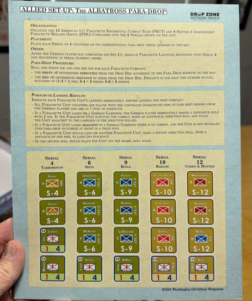 Before we got into the Airdrop Procedure, I wanted to share with you the makeup of the Allied forces who are jumping into Southern France during the Albatross Para-Drop mission on August 15, 1944. Below you will see a picture of the 5 Serials of paratroopers from the American 517 Parachute Regimental Combat Team (PRCT) (12 total) and the British 2 Independent Parachute Brigade Group (IPBG) (8 total) who are jumping into the fray on the first day of the invasion. These counters are double sided, with the exception of the French counters which are only single sided, and are easily identified with the Serial number printed on the bottom of the counters; e.g. S-4, S-6, S-9, S-10 and S-12 respectively.