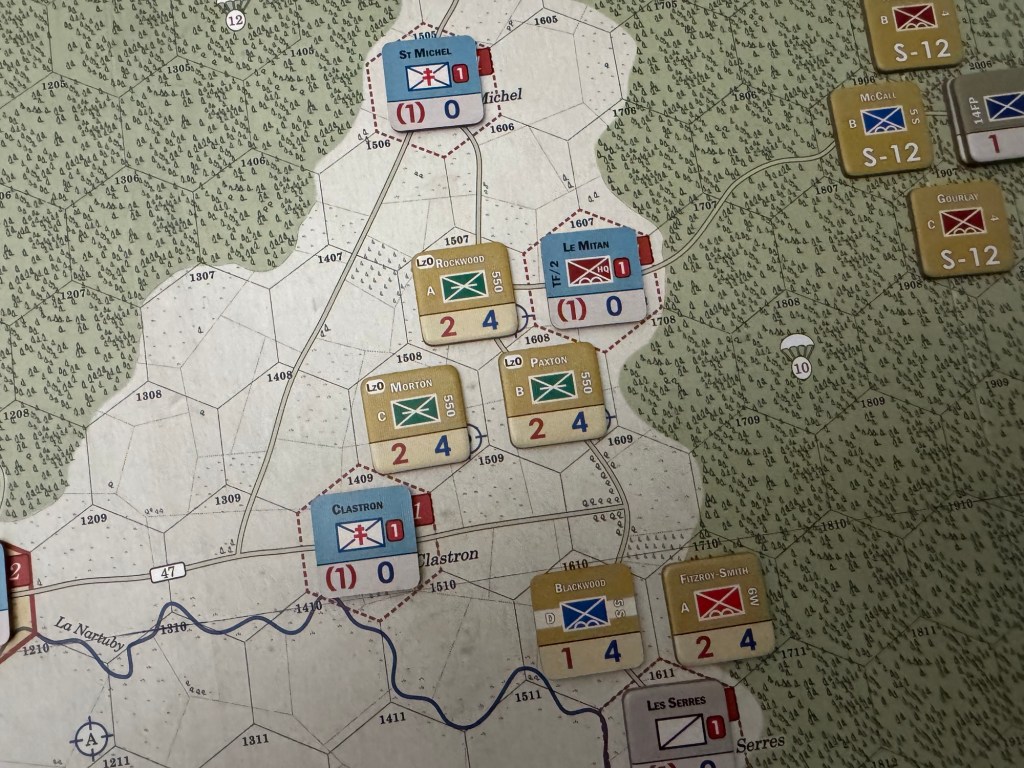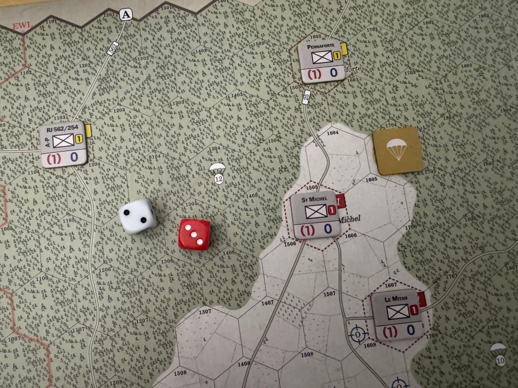 This means that the Hargraves counter will be placed in hex #1704, which is in a good position as it it is just 1 hex away from 2 of the objectives in St. Michel to the southwest and Pennaforte to the north. It was also good that the paratrooper didn’t land on the hex with the German counter as it would have had to do an attack right away.