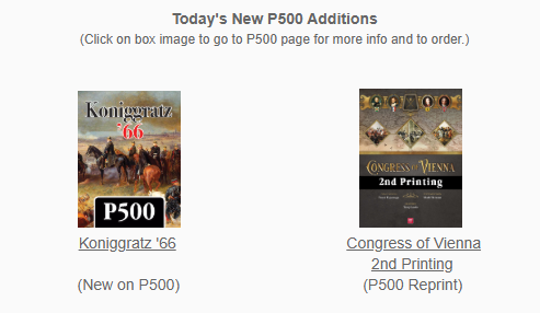 In addition to this, there was 1 new P500 offered this month in Koniggratz ’66 designed by Mark Simonitch and 1 new reprint in Congress of Vienna2nd Printing.