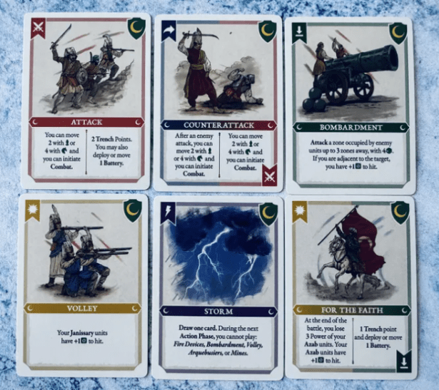 Additionally you can play Combat Command Cards, to roll dice to inflict casualties BEFORE the normal sequence of combat resolution or to enhance your striking power -as the Ottoman “Volley” cards.
