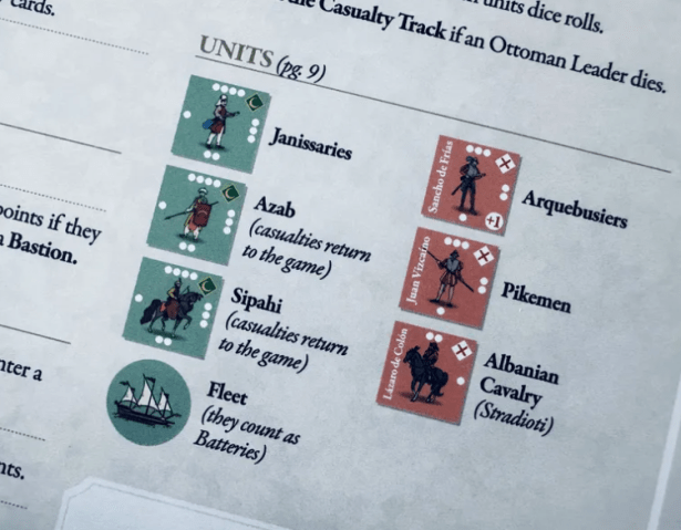 Francisco: Its purpose is to record the suffering of the Ottoman side during the siege. As soon as the marker arrives at the “12” space the game ends in a Spanish victory. The marker advances one space on the track each time an Ottoman block is eliminated (loses all its steps), an Ottoman leader is eliminated or the Ottoman player declares an Assault turn.