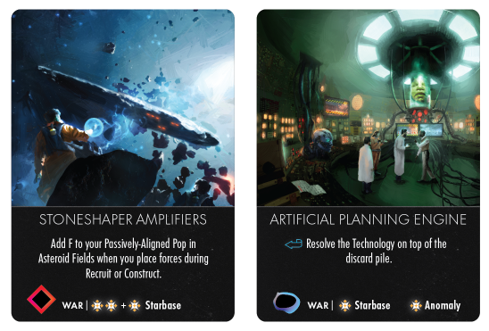 Adam: Many different types. First, technology has a sector type. Anomaly tech has a different feel to its effects than Nebula tech. Second, technology has an associated action. Recruit tech is different from War tech. Third, technology is stronger when you can spend some Salt.