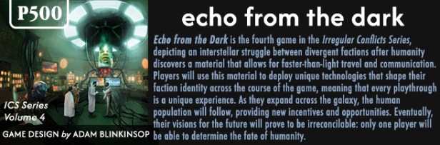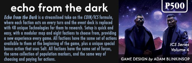Adam: Echo from the Dark is about history and science fiction. I’ve been reading sci-fi my entire life, but historical wargaming is relatively recent for me. After COIN, the idea of playing a big 4X game where all the players were imperial powers started to feel really weird. Where are the insurgents in Twilight Imperium? Where is the unrest in Eclipse?
