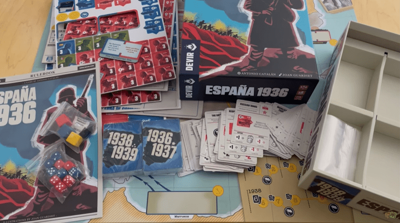España 1936 is a game of historical simulation that recreates the Spanish Civil War from 1936-1939. It is played on a board depicting Spain and divided in connected zones, with counters at operational level. It has cards to develop the events of the war and to modify decisive battles. It does not have any CRT, and the combats are simple but real for the conflict. The turn and the combats are alternative, which creates a great interaction between the players. 16 years after its first publication, España 1936 returns to stores with a completely renewed art and in an edition that includes the expansion “The Armada”, the 1938 scenario and the addition of 8 cards, for optional use, which add uncertainty to the events.