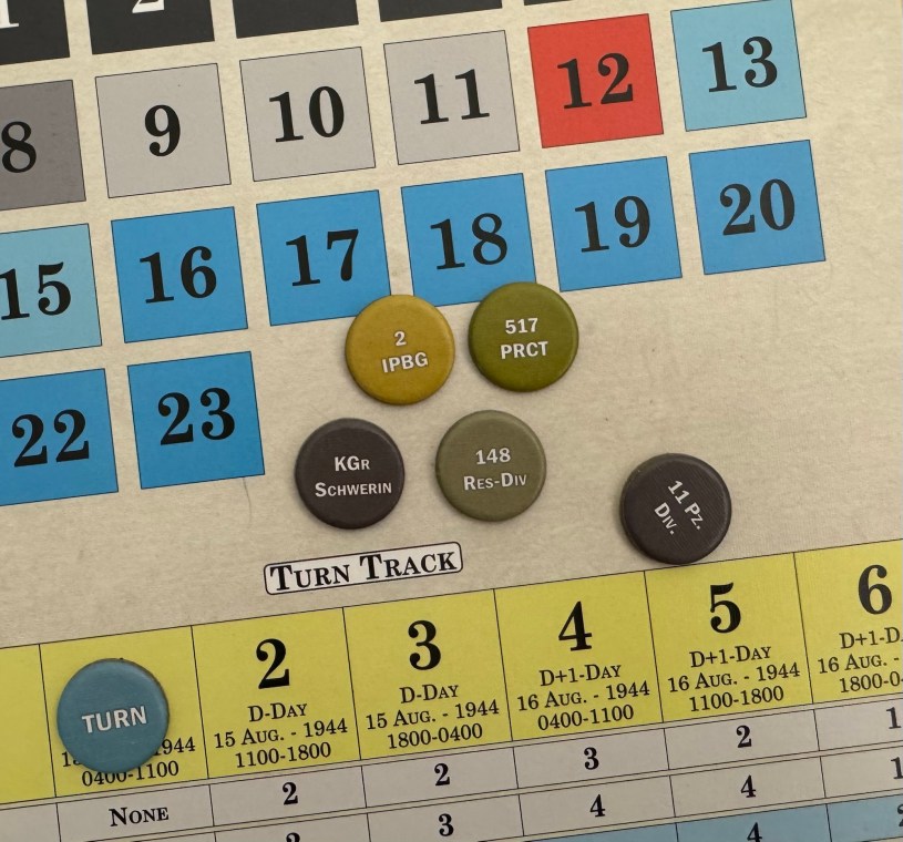 Assets are included in the game and each side gets a random draw of these Assets each turn. There are a total of 12 Asset Counters for the Allies and 10 for the Germans. The Assets will be organized according to the set-up instructions but the Assets are randomly drawn for both sides at the beginning of Turns 2-6, as indicated on the Turn Track. The purpose of these Assets is to represent the various elements that each side had access to in the operation and that do things like add dice to combats, provide changes to the initiative and give an opportunity for different Commands to attack together.