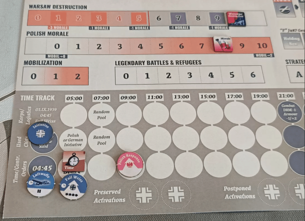 Gregorz: The game creates mostly a narrative type of experience. Thanks to the Time Track, realistic flow of time, infantry DFR limits and shifting Morale of the Polish side you can feel the dynamics of the situation. The usage of Calendar, Allies and Soviets cards additionally creates a strategic layer of the story. In the Optional Rules, which contain some of older complex mechanics, that were simplified in the course of playtesting, two narrative-focused rules are included. Both need dedicated note-sheet, which will be posted on the VUCA site for print. The first is a table to note all Legendary Battle events, that occur during the game. Legendary Battles can be achieved by the Polish player to elevate Morale level by performing actions like Cavalry Raids. Every such successfull event can be noted with the exact place and hour (e.g. Mokra village – 13:00, Wil cav brig stops German 4Pz advance, suffering high losses). The second is influenced by tens of army monographs that I’ve read the design process. Warpaths. The sheet will include spaces to write down unit ID, possibly commanders name and tables for actions. You simply focus on one unit and write down series of actions, that unit performs during the campaign. After the scenario, or better – campaign it creates very strong experience, to track down, where the unit was and how hard was combat for it.