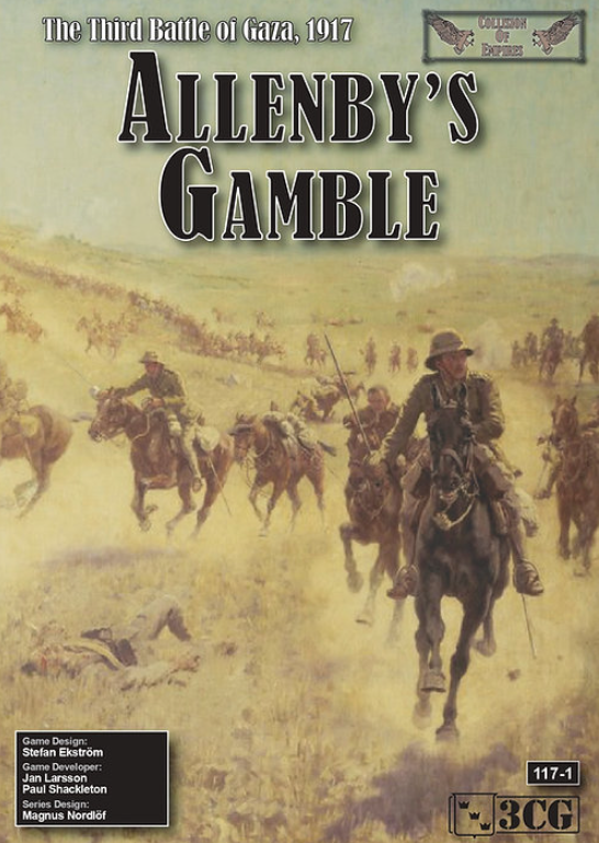Allenby’s Gamble covers the start of the Southern Palestinian Offensive of November 1917. The EEF, having failed taking Gaza twice, replaced their Commander who brought a new approach to the matter. Allenby’s strategic objective was the defeat of the Ottoman army in Southern Palestine, decisive enough to ensure Ottoman reinforcements being diverted to Palestine. The offensive started with a joint attack on Beersheba at the eastern end of the Gaza – Beersheba line. The following day, the Battle of Tel el Khuweilfe began, with an advance into the Judean foothills. This move up the road from Beersheba towards Jerusalem not only threatened Hebron and Bethlehem but also forced the Ottoman commanders to deploy their reserves, to hold the EEF threat. The Third Battle of Gaza then took place on the Mediterranean coast, starting with the largest barrage during WW1, outside the European Theatre. The Battles of Hareira and Sheria was then launched on the center to bind as many enemy troops as possible. Allenby’s Gamble simulates the first 10 days of this Campaign. Rules and mechanics are developed from the Tannenberg 1914 game released in 2010 now forming the Standard Rule System for Collision of Empires with chit-pull mechanics.