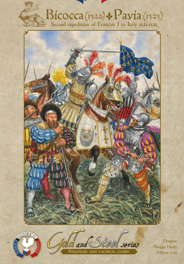 A few years ago, I became aware of a new French publisher called Serious Historical Games and one of the games in particular caught my eye in Nagashino 1575 & Shizugatake 1583: Battles of the Sengoku Jidai. We purchased a copy and played it and really enjoyed the system, including the combat, the gorgeous cover and the fantastic counter graphics. That same publisher has ready for pre-order a new game in the Gold and Steel Series called Bicocca (1522) – Pavia (1525): Second Expedition of François I to Italy.