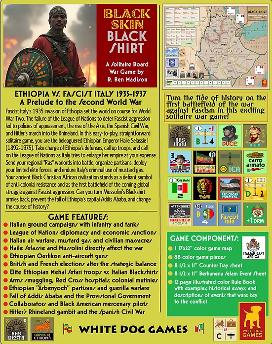 I have really enjoyed my plays of several games designed by R. Ben Madison. He has a knack for including elements of the history into the gameplay while placing the events into the framework of his chosen system, which is usually the States of Siege Series…but not always. His newest offering called Black Skin Black Shirt: Ethiopia vs. Fascist Italy 1935-1937 from White Dog Games uses the States of Siege Series System and looks really interesting as it delves in pre-WWII conflict in Africa.