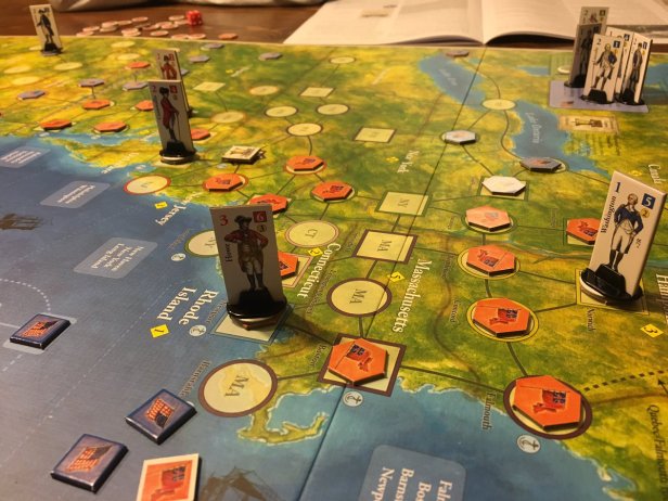 I have played all three of the Birth of America Series Games from Academy Games including 1754: Conquest – The French and Indian War, 1812: The Invasion of Canada and 1775: Rebellion and all use a similar system of card play to activate units and perform actions. The game is a “dudes on a map” deal where players are trying to control key areas and cities. I really like this series as you can play it perfectly well with 2 players but it also allows for up to 4 players which involves some table talk and strategizing, which I really enjoy. 1775 is an introductory wargame designed so that families can play together, to learn about the history of the American Revolution, and that Grognards can also enjoy as a light war game.