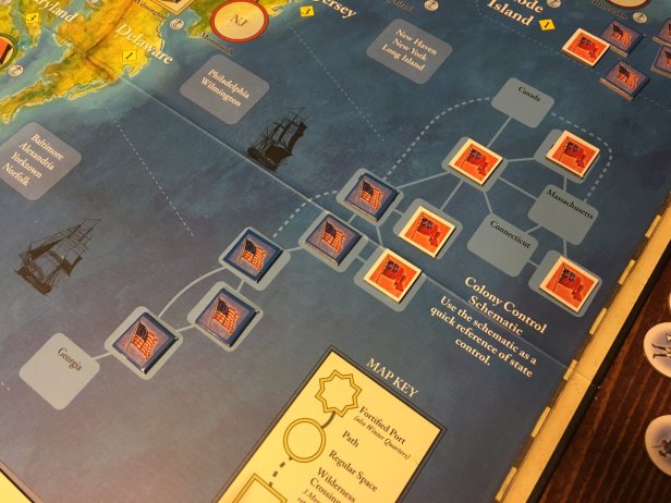 The objective of the game for the British player is to control certain spaces in order to fulfill their Victory Conditions. The Patriot player’s objective is simply to prevent the British Victory and this really makes for some interesting choices on the very well done map. There were two elements that we found very interesting including sea movement and the way that the Patriots could recruit forces.