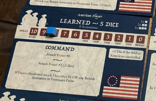Saratoga 1777 AD is a medium weight wargame that is designed to play fairly quickly and provide some very interesting tactical choices. There were two parts of the game that I particularly liked, that felt really appropriate for a game covering the Revolutionary War revolving around Command and Control and Unit Morale.