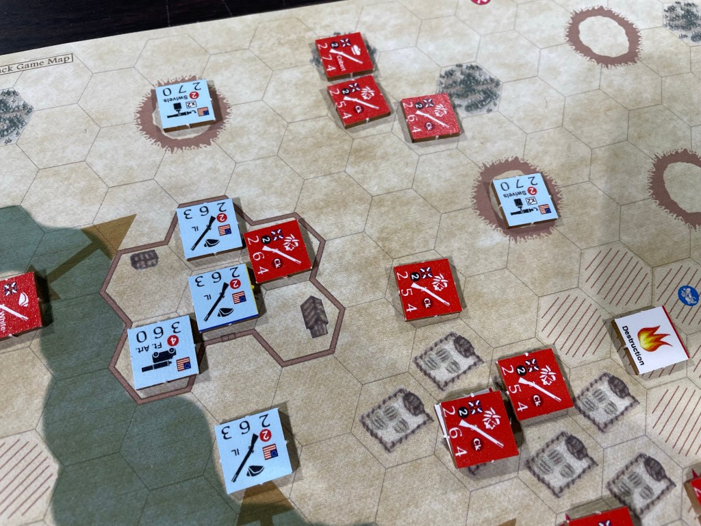 There are a couple of things that I really liked about this one as I felt it told the story of the style of fighting of the time and incorporated some elements that were very important. This series has centered the focus on formations and how they can interact with each other on the battlefield. It simply looks at how the relative positioning of the formations opens up opportunities for attack or provides advantages or disadvantages to one side or the other. If you are above an enemy formation on high ground or have a superior firing angle on a formation in battle, shouldn’t you gain an advantage? And furthermore, if you are relatively inexperienced green forces and are facing the smoking gun barrels of your enemy’s cannons, don’t you think that your attempts to return fire will be less effective than if firing with hardened troops from cover? This spatial element is a major inclusion in the design and really feels right and makes your choices as commander that much more difficult as you decide how to activate your troops to take advantage of the situation. I really have enjoyed this spatial relationship during my plays of the game and think that the approach is very novel.