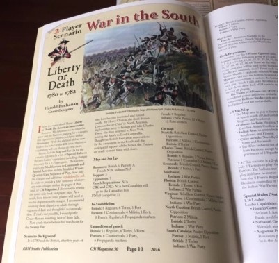 If you are interested in War in the South Scenario for Liberty or Death: The American Insurrection in C3i Magazine #30 from RBM Studio, you can order a copy from the Noble Knight Games website at the following link (as the magazine is sold out on Amazon and at RBM Studio): https://www.nobleknight.com/P/2147654084/30-w-South-Pacific