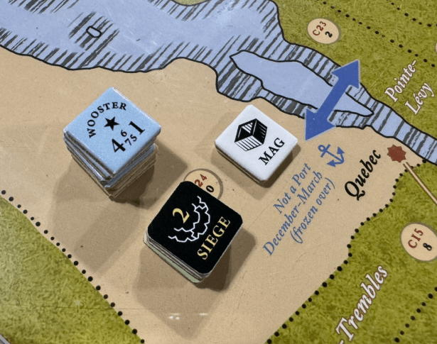 Each turn, there are 13 chits that can be blindly drawn and include 2 supply chits, 2 event chits, 5 British Primary Leader chits and 4 American Primary Leader chits. The Leaders have a certain amount of Leadership points that can be used to take certain actions like marching, forage and recruiting. The players will have to keenly manage these limited actions in order to make sure that progress is being made.