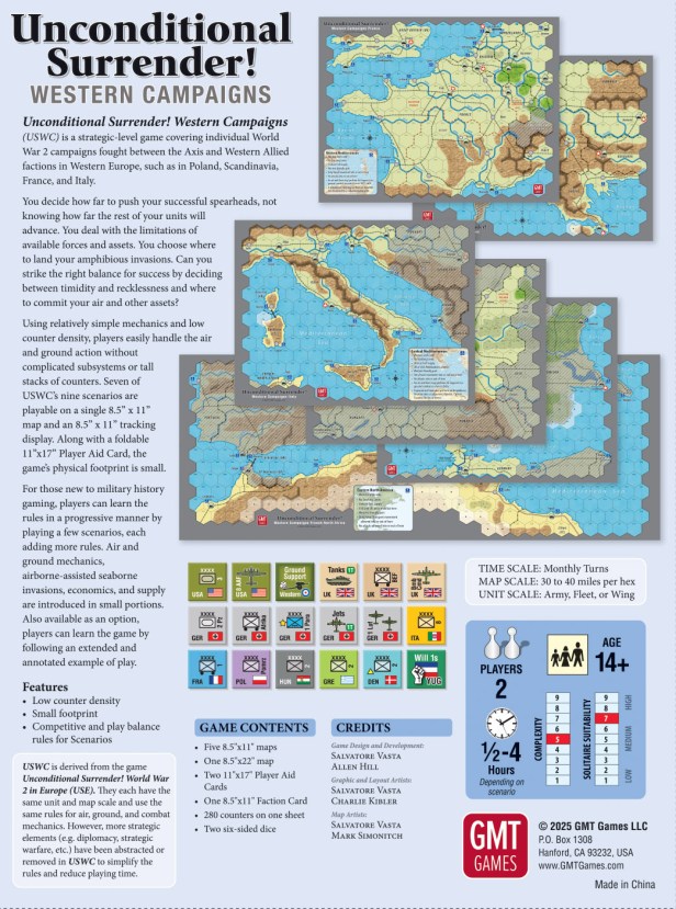 The first item they shared was the Box Back for the upcoming Unconditional Surrender! Western Campaigns designed by Salvatore Vasta. This game is a smaller, geographically, bite sized look at the fighting in the European Theater on the Western Front. This is basically USE light and you should remember that when taking a look at the game.