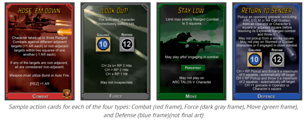 • Action cards include unique Combat, Defense, Move, and Force types