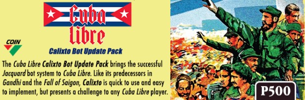 As I write this we are preparing to send all the Calixto materials out to our proofreading team, so by the time you read it we should be just about ready to send it to the printer! It’s been a long road, certainly much longer than any of us anticipated, and not least due to the surprisingly large challenge of designing a non-player system for a game as (relatively) small as Cuba Libre. Partly this has to do with the nature of the Jacquard non-player system, which as I have tried to emphasize before is really a custom job for each COIN game it is applied to, with relatively little transferability between games. However, another large element of the challenge is that in such a small game every little action matters so much more than it would in a larger game, so there is much less margin for error when it comes to misplays by the non-player factions. This has been an interesting aspect of the design process that now seems obvious in hindsight but wasn’t clear to us when we began working on Calixto. Anyway, it’s done now, and we’re looking forward to getting it into your hands so that you can enjoy the fruits of our hard labors! – Joe