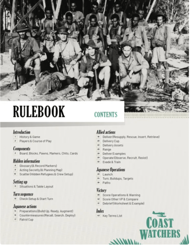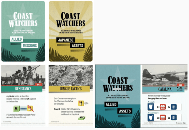 Next we got a look at a few pieces from Coast Watchers designed by Volko Ruhnke. The first was the final rule book cover and then we got a look at a few cards. I do love the color choices on the card backs and the image. Just clean and attractive!