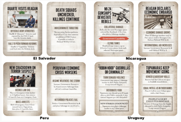 In contrast to El Salvador and Nicaragua, the conflicts in Peru and Uruguay are relatively poorly documented, especially in Uruguay where the Tupamaros systematically destroyed all photographs of themselves before they went underground (and of course were careful not to be photographed after this). For Peru we made do with what we could find, leaving only around ten cards without images (out of 40 total cards). For Uruguay we instead decided to embrace the lack of images, making this a positive feature of the game by using the additional space on the cards for a novel “Breaking News” mechanism, which is an additional effect that triggers at the end of each round if neither player manages to block it. You can see a couple of these effects at the bottom of the two Uruguay cards we’ve selected to share with you.