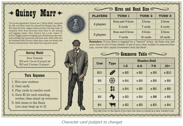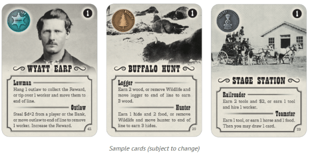 The sequence of card plays combined with the arrangement of workers in each job line determines who gathers resources or earns money. There are five types of goods in the economy: food, horses, hides, tools, and wood. The more items you gather of a given commodity, the higher price-per-item you get when you sell that good. But diversifying your business across multiple job types improves your end game score. Furthermore, you might use some goods as capital investment when you hire new workers, else you must pay the maximum cost for that investment.
