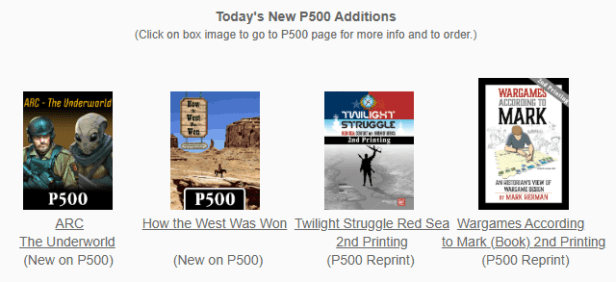 There were 2 new P500 games offered this month including ARC – The Underworld, a small-unit tactical combat game set in an ahistorical Earth setting, and How the West Was Won, an economic simulation game set in the growing west of 1845-1890, both non-traditional games but interesting nonetheless, and there were 2 reprints offered in Twilight Struggle: Red Sea – Conflict in the Horn of Africa 2nd Printing and Wargames According to Mark 2nd Printing.