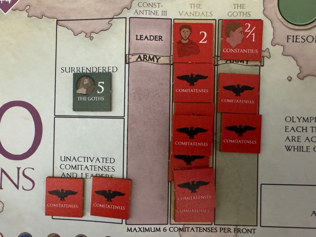 One of my favorite parts of the game is the combat. You have a standing army that you assign a leader and also place on a specific track that is attacking Barbarian hordes in that region and have to go about trying to destroy them and quell their resistance to Roman rule. This combat is brutal and sometimes is very challenging if you don’t have the right leader, enough soldiers and the right cards in hand. As you drive the Barbarians back toward their homeland though, their defensive abilities improve as they are more familiar with the terrain as they are fighting on their home court. When you get to the very end of their tracks at their Home space, this Terrain Value bonus will increase to +7 or higher and makes winning combats very, very difficult…unless of course you have the right cards in your hand! One of my favorite cards for this situation is Frankish Mercenaries.