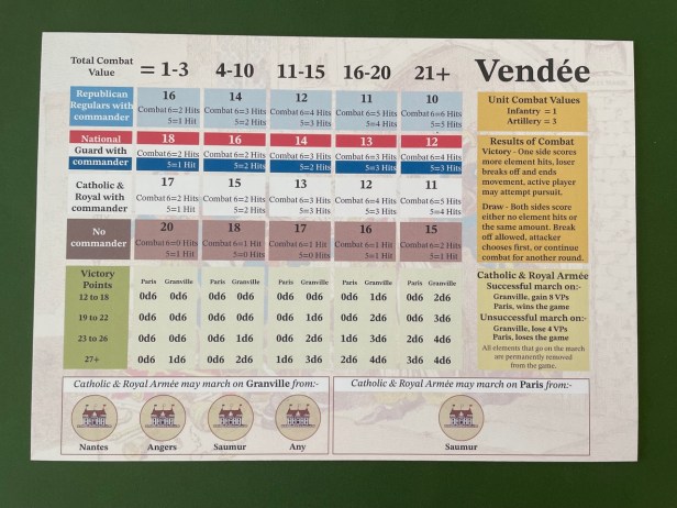 The Royalist player must capture the major towns on the map, representing the region of the Vendée Militaire and the surrounding area, displace the Republican’s from the region and defeat any Republican forces sent against them. Each combat they win against an enemy commander and each major town they capture, will gain them victory points. If they reach 40 VP’s they instantly win the game. Alternatively, victory may be gained by a successful march on Paris by a Royalist army.