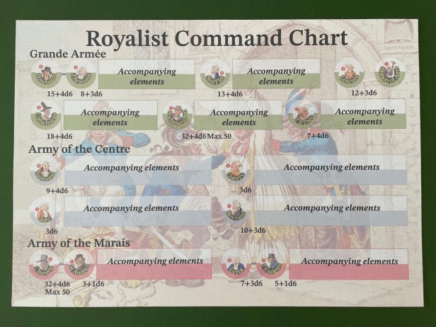 Andrew: Mustering of peasants and National Guard had to be considered in the design and both had to be different. The Republicans controlled major towns and could raise the National Guard when threatened by Royalists, but the variable nature of the mechanism we’ve used means a successful muster is never guaranteed. The Royalists can ring the Tocsin in their heartland to muster peasants to the army, but these troops are often needed far away, leaving commanders at the front, exposed with few resources.
