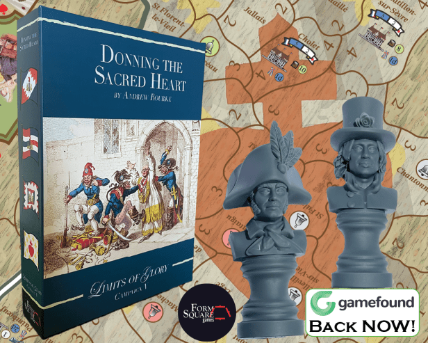 A few years ago, we became acquainted with Andrew Rourke through his Coalitions design from PHALANX that went on to a successful crowdfunding campaign. He has since been a busy guy with starting his own publishing company called Form Square Games and also publishing the first 3 designs in a new series called Limits of Glory that will take a look at the campaigns of Napoleon and other contemporary conflicts. In Campaign I, which is called Bonaparte’s Eastern Empire, the game is focused on the campaign of the French in Egypt between 1798 and 1801. Campaigns II, III and IV are Maida 1806 and Santa Maura & Capri. Recently, an announcement came out about the fifth campaign and it is set during the French Revolution and the Civil War in the Vendée in 1793 and is called Donning the Sacred Heart. We reached out to Andrew and he was more than willing to answer our questions.