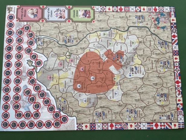 Andrew: Players are constantly faced with the dilemma of either re-rolling failed dice or saving glory for later. Failed dice can be re-rolled when activating for movement, mustering National Guard or ringing the Tocsin. During combat, your own and your opponent’s dice can be re-rolled, or when gaining momentum markers and marching on Paris or Granville. So many demands and often so little Glory, makes for some interesting decisions. There is no right or wrong; the game is designed to examine the effect of luck on destiny.