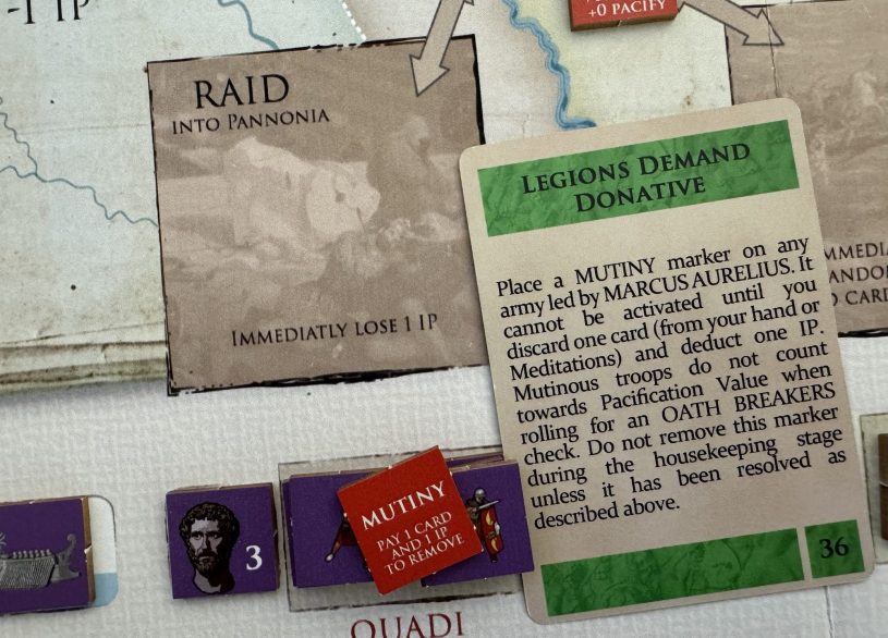 In this entry, we are going to take a look at one of the Barbarian Cards that causes havoc and inconvenience for the Roman player in Legions Demand Donative. In the Barbarian Deck, there are several cards which cause the Roman player to have to spend their scarce actions or resources toward taking care of a standing problem that arises. These problems are associated with all types of situations as mentioned above but one that is solvable. Legions Demand Donative creates a Mutiny marker to be placed on any army lead by Marcus Aurelius himself. This causes that army to be unable to be activated and used to fight back the advancing Barbarians. But, more importantly, it causes the loss of 1 Imperium Point or IP. Imperium Points are a way to measure the authority of Marcus Aurelius and the confidence in him of the people of Rome. This Imperium Track can go up or down with events from cards or down due to poor battles (bad dice rolls with an army led by Marcus Aurelius). When you lose an IP, players will move the marker down and when they gain an IP it will move up. But you must pay attention to this Track as if the marker ever reaches the bottom space, Marcus Aurelius is considered to have been usurped and the player will automatically lose.