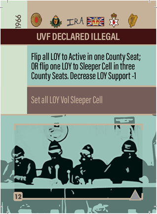 Hugh O’Donnell has agreed to provide us with a few more thematically connected Event Card Spoilers to share on the blog. This upcoming set of 8 cards will be connected to the Loyalists Faction, which is 1 of the 2 para-military groups included in the 4 faction game.